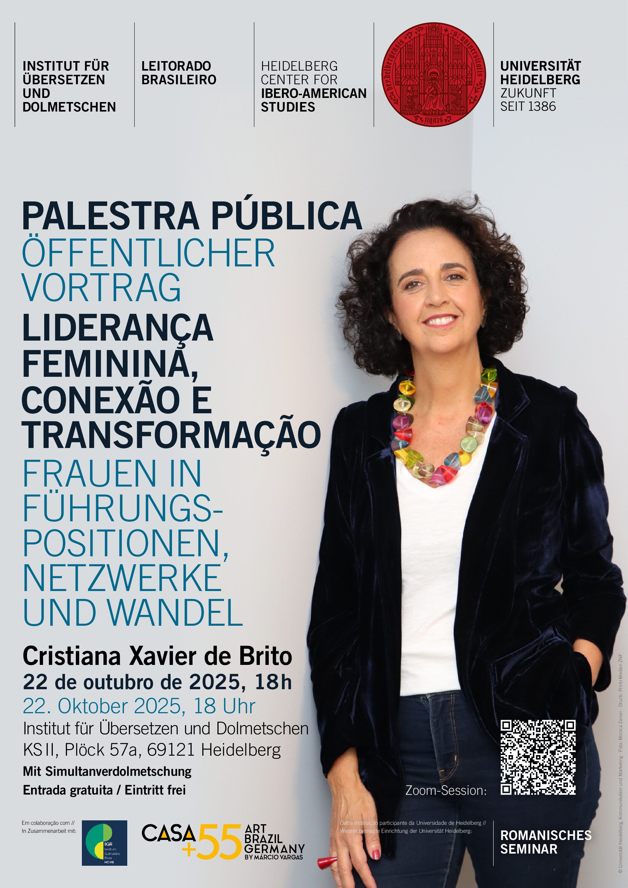 22. Oktober. 2025 Öffentlicher Vortrag – Frauen in Führungspositionen, Netzwerke und Wandel Co-organized with: Instituto de Tradução e Interpretação (IÜD), Romanisches Seminar, Casa+55. Ort: Institut für Übersetzung und Dolmetschen, Konferenzsaal II, Endereço: Plöck 57a, 69117, Heidelberg Informationen zu früheren Veranstaltungen finden Sie in unserem Archiv